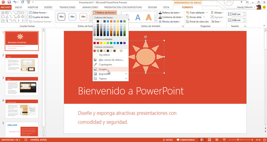 Al igual que un color o una textura puede insertar una imagen como relleno de forma. Las imágenes que puede insertar pueden ser JPG, BMP, PNG y otros.
