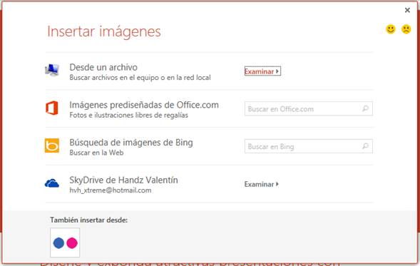 * También puede usar el buscador de Bing para encontrar una imagen desde internet o usar la opción de SkyDrive donde tenga imágenes almacenadas.