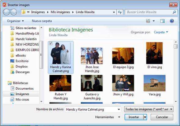 Por defecto PowerPoint 2013 busca las imágenes en la Biblioteca Imágenes, así que si tiene imágenes en su Cámara digital, Pendrive (Memoria USB), en su SD, CD, DVD, Blu Ray, o descargado de Internet, guárdelo en esta carpeta.