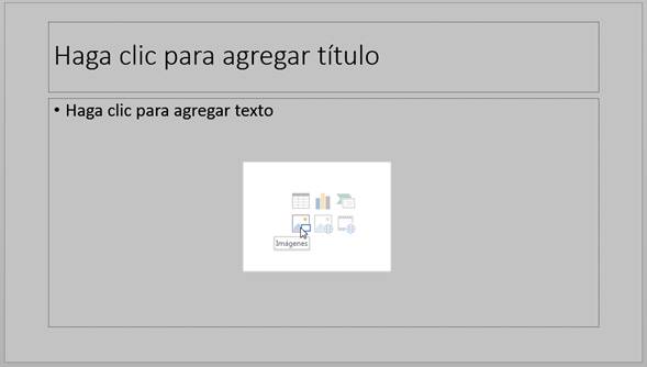 También puede insertar una imagen desde el marcador de posición Haga clic para agregar texto en el diseño Título y objetos. En el medio se encuentran una serie de iconos, haga clic en el icono Imágenes desde archivo.