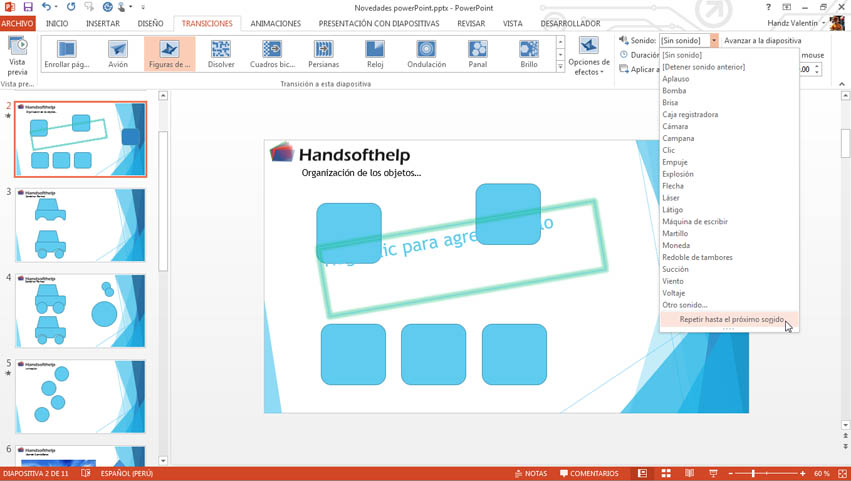 Puede aplicar un sonido al efecto de transición. Puede elegir entre los diversos sonidos que llegan con Office 2013 o elegir uno desde archivo. Además puede activar la opción Repetir hasta el próximo sonido para que el sonido se repita hasta que aparezca una nueva diapositiva con un sonido diferente.