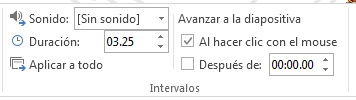 Al insertar un efecto puede aplicar intervalos especiales para que la animación dure una cierta cantidad de segundos, o que se pueda escuchar un sonido mientras aparece el efecto, etc. Todo esto se encuentra en el grupo Intervalos.