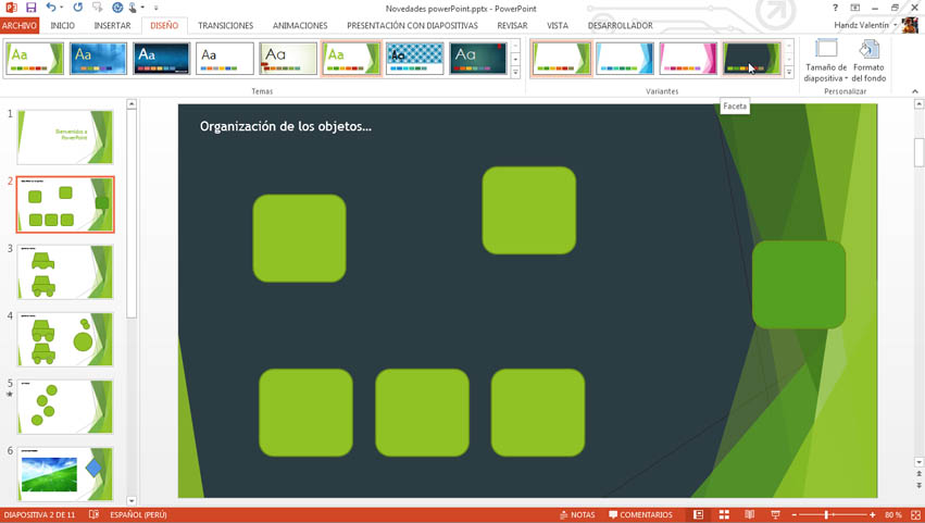2° En el grupo Variantes, haga clic en alguna de las variantes predefinidas para el tema.