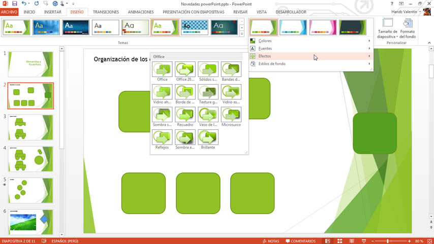 Los temas poseen una serie de personalizaciones que se aplican al elegir un tema de la galería. Estas personalizaciones se basan a los colores, las fuentes y efectos. Si desea, puede cambiar las combinaciones de colores en el tema elegido.