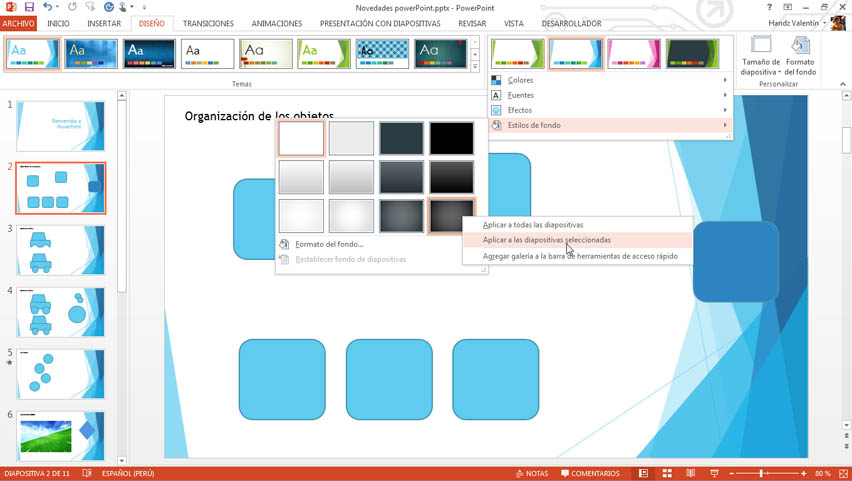 Cuando elige un estilo de fondo generalmente este se aplica a todas las diapositivas dentro de la presentación, pero es posible que el fondo solo quiera aplicar a su diapositiva seleccionada, para ello puede hacer lo siguiente.