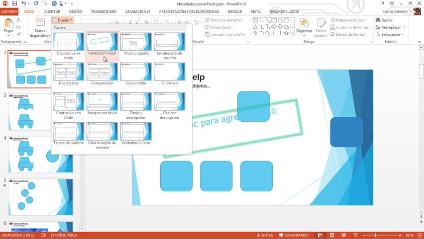 Puede seguir creando diseños para sus diapositivas, por ejemplo el Tema por defecto es Tema de Office y a este se le puede agregar un nuevo diseño. La siguiente imagen muestra un nuevo diseño de diapositivas.