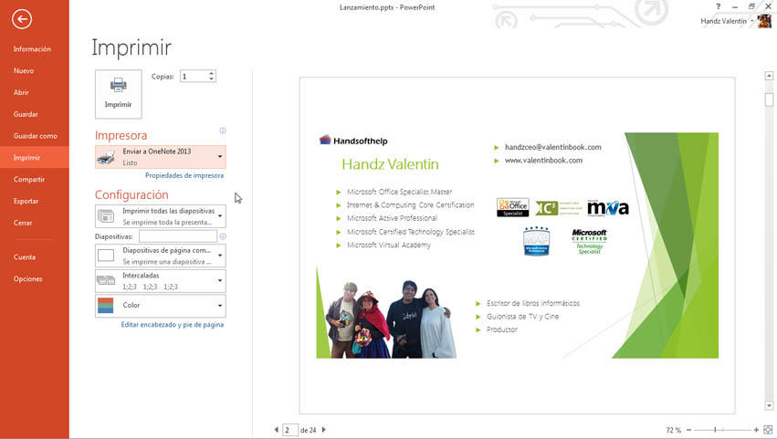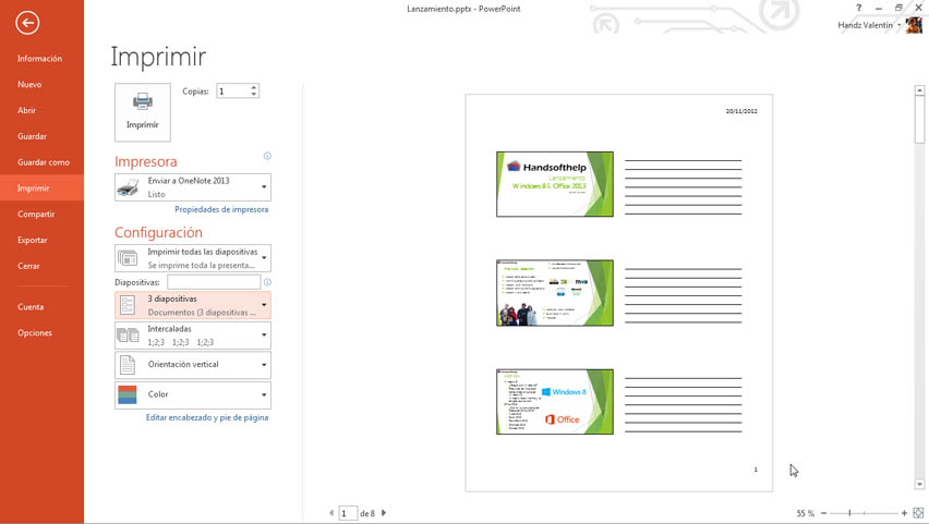 Cuando hace clic en el botón Imprimir comienza la impresión del documento. Así que una presentación en PowerPoint no simplemente se puede ver y manipular efectos, también lo podemos tener de manera física, como un documento.