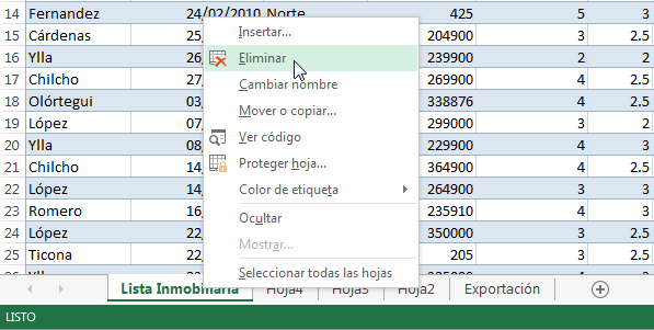 1° Haga clic derecho en una Hoja y clic en Eliminar.
