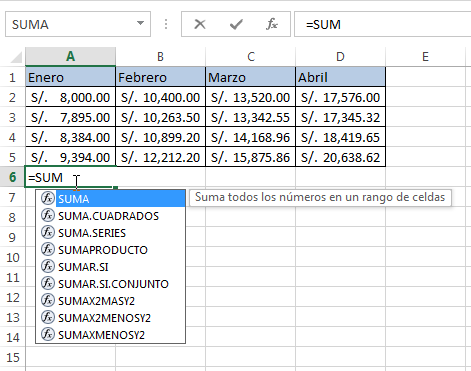 Existen varios métodos para comenzar a insertar una función. Lo primero que muchos hacemos es la forma común; manualmente. Cuando inserta el signo igual “=” y comienza a escribir la primera letra de la fórmula, automáticamente aparece una lista dinámica que va cambiando en base a lo que vayas escribiendo.