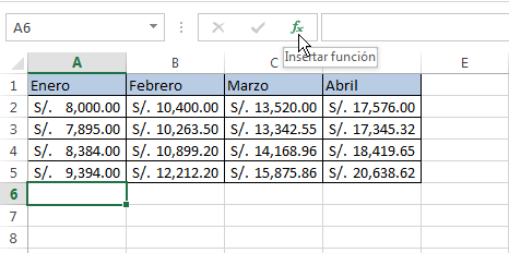 Otras de las formas de ingresar una función es a través del comando Insertar función en la barra de fórmulas.