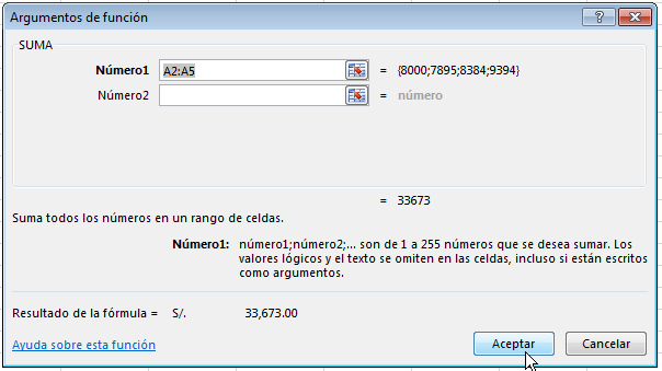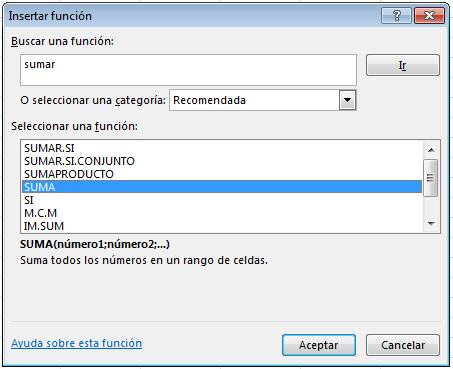 Seleccione una función y haga clic en Aceptar. En la siguiente imagen, se muestra la función SUMA seleccionada.