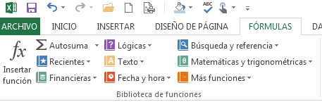 También puede usar la ficha Fórmulas, dentro del grupo Fórmulas para insertar las funciones que necesita. Estas funciones se encuentran categorizadas para que pueda acceder a ellas más sencillas.