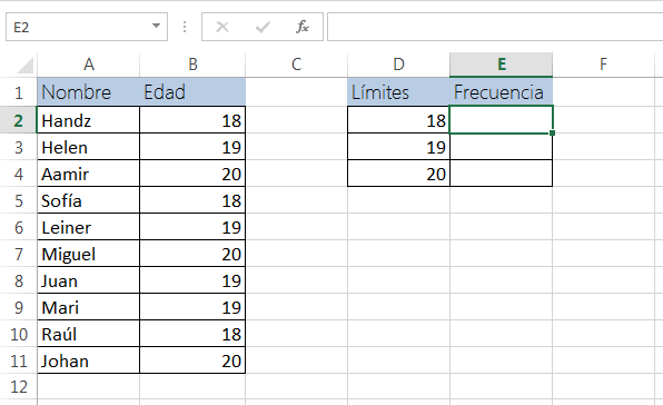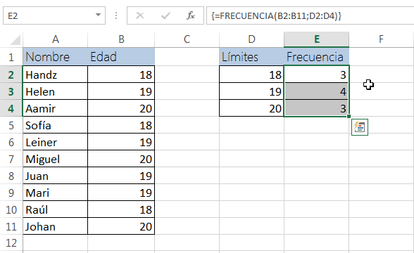 2° Escribir la función matricial en nuestro caso =FRECUENCIA(B2:B11,D2:D4)