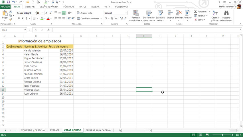 Por ejemplo, la siguiente imagen muestra una lista de datos de los empleados y su fecha de ingreso a la empresa. En esta ocasión nos piden crear un código para cada empleado usando los datos que ya están ingresados en sus respectivas columnas.