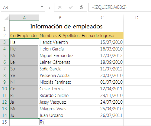 1° Seleccione la celda A3 y escriba: =IZQUIERDA(B3;2).