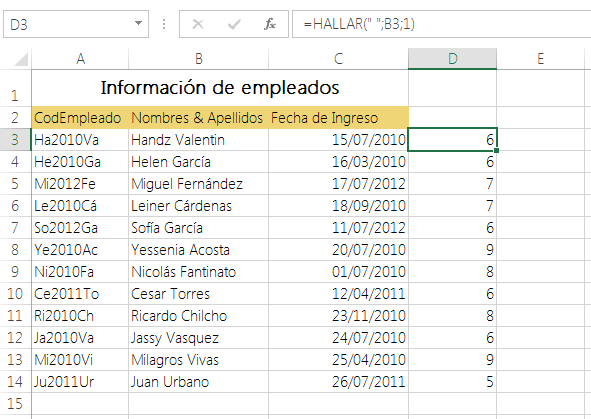 Manejemos el siguiente ejemplo. En la columna D, a partir de D3 escribiré la siguiente fórmula: =HALLAR(" ";B3;1). Pulsaré un Enter y copiaré a las demás celdas para observar cada uno de los resultados.