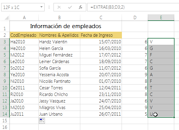 Acabamos de decirle a la función EXTRAE que en el texto de B3, empezando desde la posición en D3, extraiga 2 caracteres. Como resultado en E3 será “ V”; aparentemente se muestra solo una letra, pero note también el espacio en blanco antes de la letra, y es que EXTRAE comienza a extraer caracteres a partir de la posición misma. ¿Cómo hago para que no aparezca el espacio y se muestra la segunda letra del apellido?