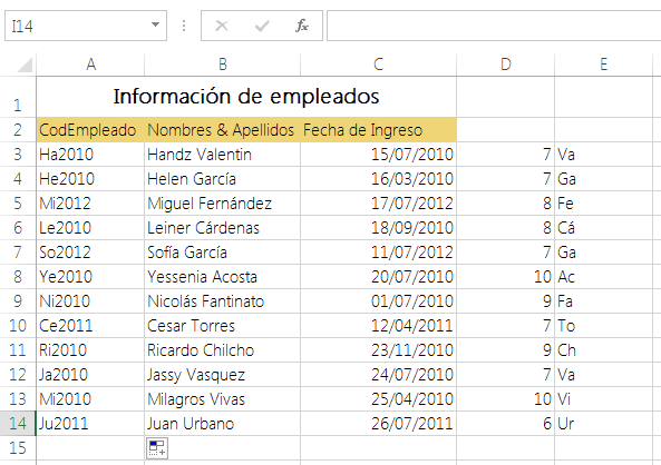 Estamos a la mitad de la creación del código y viene la sección más interesante, obtener las dos primeras letras del apellido. Para comenzar a trabajar primero debemos encontrar alguna lógica a nuestros datos, por ejemplo ¿El apellido a partir de qué carácter comienza? Bien, como podemos observar en la imagen, el apellido comienza después de un espacio en blanco, de modo que tenemos que encontrar, mediante una función de Excel, el espacio en blanco.