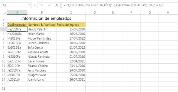 Ya obtuvimos el resultado deseado, quizá hayas quedado exhausto después de editar a cada momento la fórmula, pero lamento decirte que nos falta el paso más importante, ¿Cómo obtener las dos primeras letras del apellido para el código del empleado? Si, ya obtuvimos las dos primeras letras pero por separado, ahora falta unirlo. En A3, modifique su fórmula para que quede como la siguiente expresión: