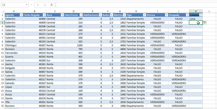 Puede agregar más filas y columnas a su tabla. Haga clic en una celda a la derecha de la última columna de su tabla e introduzca algún dato. Excel automáticamente expande horizontalmente su tabla creando un nuevo encabezado de columna llamado Columna1.