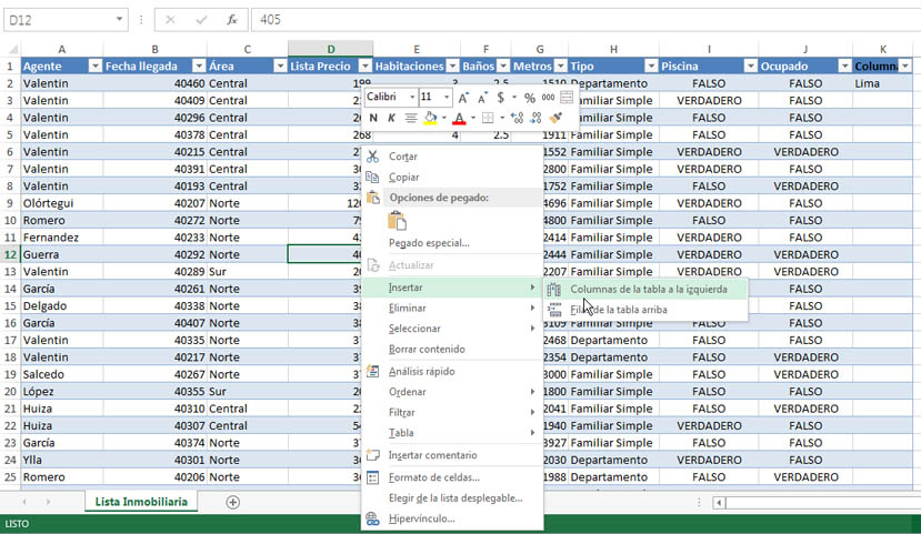 Si desea introducir filas y columnas dentro de su tabla (sin usar las opciones de expansión), haga clic derecho sobre su tabla y señale Insertar y podrá elegir entre las opciones Columnas de tabla a la izquierda, Columnas de tabla a la derecha, Filas de la tabla abajo o Filas de la tabla arriba.