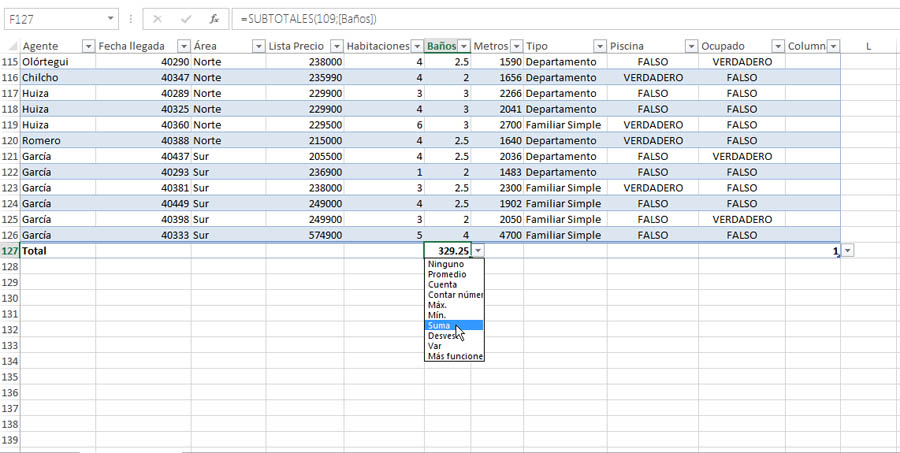 Fila de totales: Permite activar o desactivar la fila de totales. La siguiente imagen muestra la nueva fila de totales agregada al activar la casilla Fila de totales.