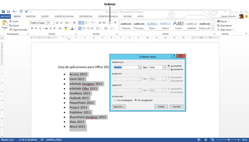 Si desea ordenar una lista después de crearla, por ejemplo en orden alfabético, puede utilizar el botón Ordenar en el grupo Párrafo de la ficha Inicio de la cinta de opciones. Tenga en cuenta que cuando ordena una lista numerada, solo se ordenan los elementos de la lista, no los números (por lo tanto, el número 1 aparecerá en primer lugar, y así sucesivamente).