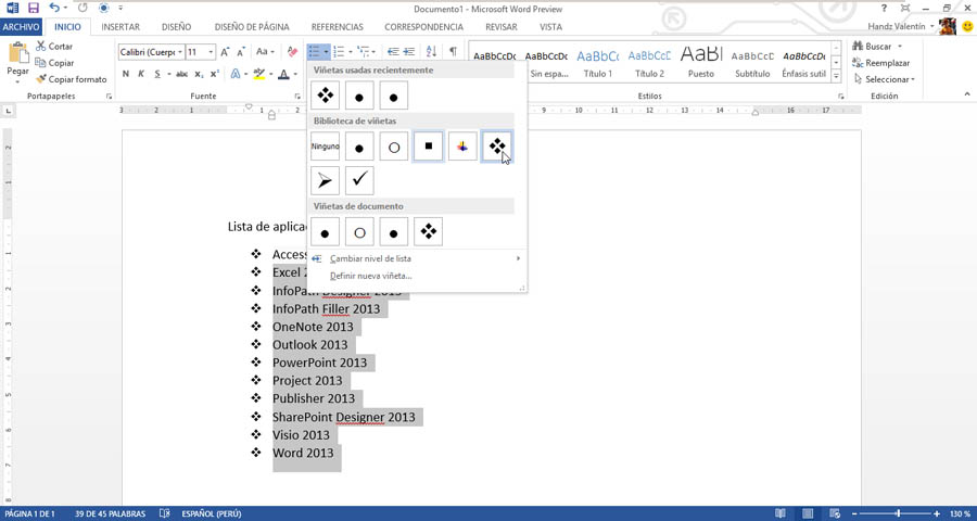 Si tiene una lista con viñetas que utiliza los mismos aburridos y tediosos círculos negros, hay buenas noticias para usted: puede cambiar el diseño por uno de los numerosos nuevos diseños integrados. Solo tiene que hacer clic en la flecha situada junto al botón Viñetas para ver la Biblioteca de viñetas.