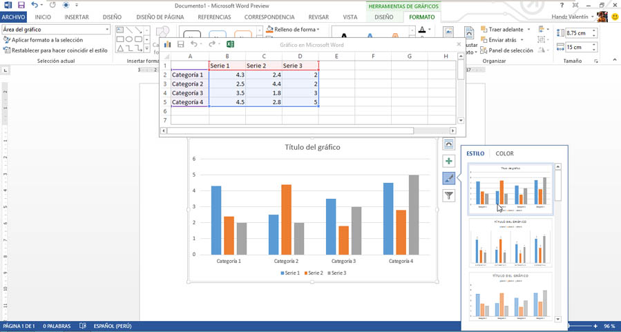 Otras de las novedades en el motor de gráficos es que ahora a la derecha aparecen una serie de etiquetas que permiten personalizar el gráfico de manera más rápida. Por ejemplo, la siguiente imagen muestra algunos estilos de gráfico que se pueden aplicar al objeto en el documento.
