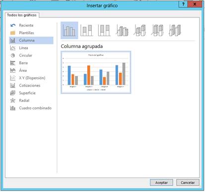 3° En el cuadro de diálogo Insertar gráfico, puede hacer clic en cualquiera de las categorías y buscar su gráfico adecuado.