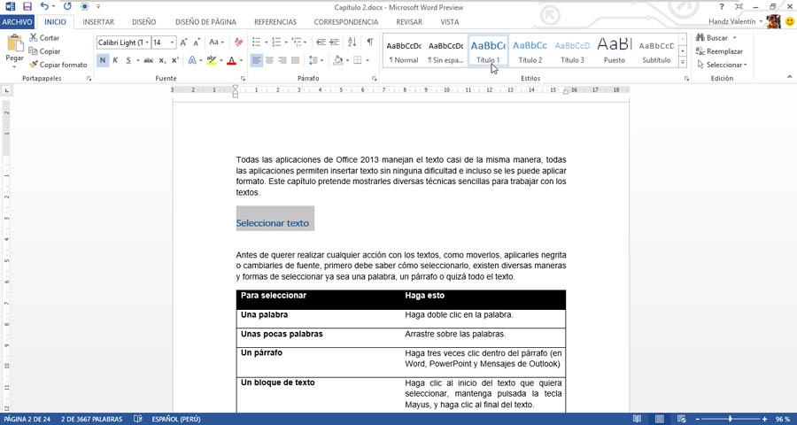 1° Seleccione el texto que desea que aparezca en la tabla de contenido.