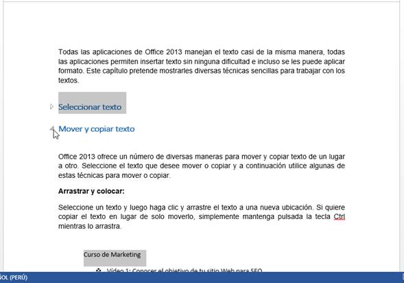 Una nueva característica en Word es que mediante la vista Diseño de impresión usted puede expandir o contraer un texto con el estilo de Título 1. Por ejemplo, señale un texto con el estilo correspondiente y a la derecha aparecerá una pequeña etiqueta con la cual puede expandir o contraer el contenido que está bajo el Título 1, observe la siguiente imagen.