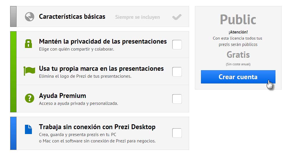 Prezi te muestra tres tipos de licencia a elegir: