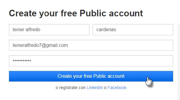 4. Escribe tus datos como nombre y apellido, un correo válido y su contraseña. Luego pulse en el botón créate una cuenta gratuita pública.