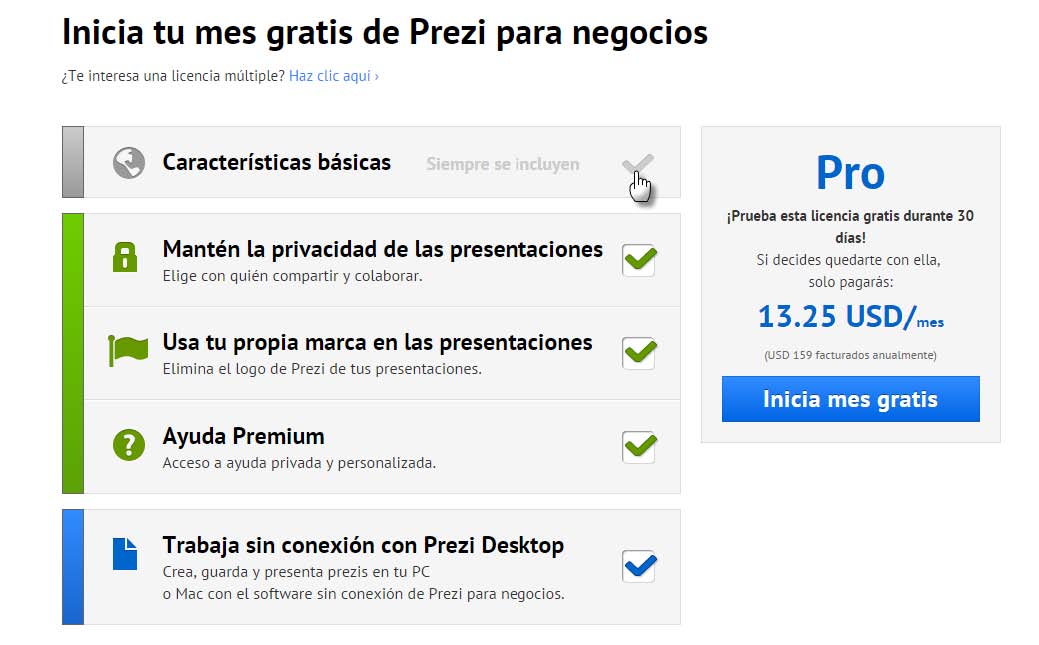 Licencia Pro: Esta licencia cuenta con el mismo paquete que la licencia Enjoy, además te permite descargar e instalar un Prezi en tu escritorio donde podrás crear tus presentaciones en tu Pc sin necesidad de una conexión a Internet y te ofrece un almacenamiento de 2 gigabytes.