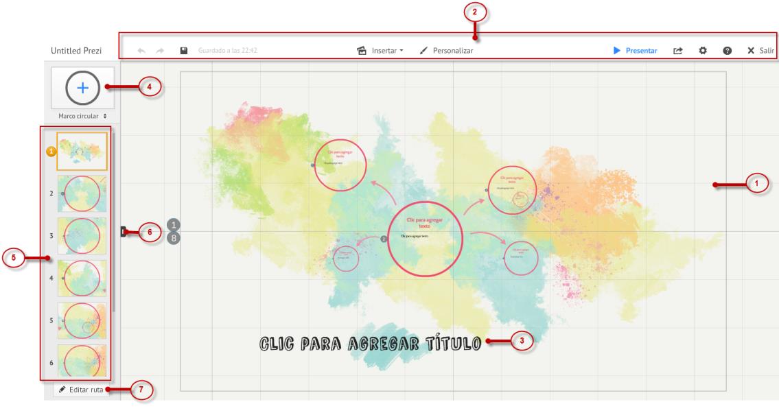 En esta ocasión vamos a conocer la interfaz de Prezi, para ello empezaremos por reconocer nuestra área de trabajo o lienzo.