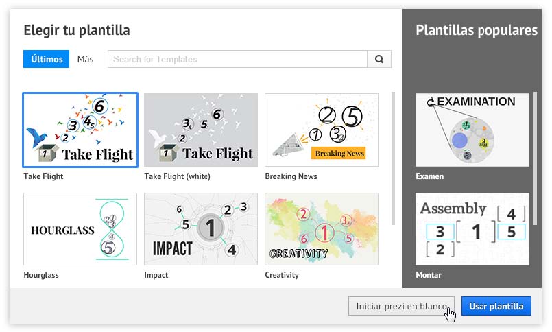 1° De la sección plantilla haga clic en el botón Iniciar Prezi en blanco.