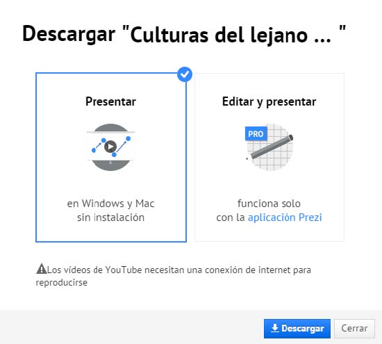 Aquí tiene dos opciones, la primera es para aquellos usuarios que eligieron la versión gratuita y la segunda para aquellos usuarios que optaron por el de pago, la diferencia radica en que los usuarios que cuentan con una licencia de pago pueden editar su prezi en su PC sin conexión a internet, mientras que los de cuenta gratuita no lo pueden hacer.
