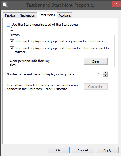 2. En el cuadro de diálogo Taskbar and Start Menu Properties (Propiedades de la barra de tareas y el menú inicio) desactive la casilla Use the Start menu instead of the Start screen (Usar el menú Inicio en lugar de la Pantalla inicio.)