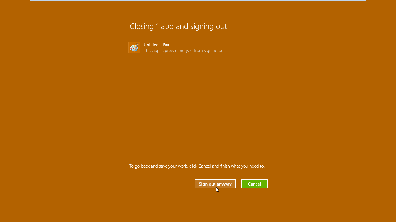 7. Si no ha guardado su trabajo, haga clic en Sign out anyway para forzar el cierre de sesión. Por otro lado, puede usar Cancel, guardar su trabajo y luego volver a cerrar la sesión.