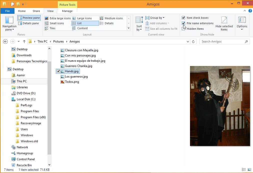 15. En el grupo Show/Hide haga clic en File name extensions. Ahora se muestran las extensiones de los archivos.