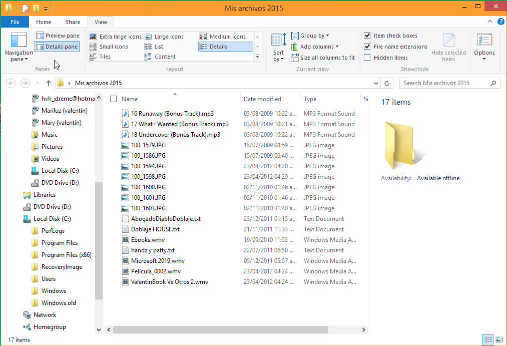 1. Abrir la carpeta Mis archivos 2015 y activar el panel detalles desde la ficha View en el grupo Panes. Observe que en el panel detalles se muestra el número de ítems que se encuentra en la carpeta, en este caso 17 ítems.