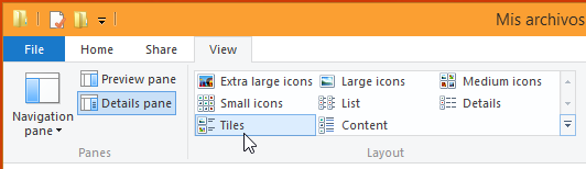 2. En la ficha View, en el grupo Layout, verifique que esté activo la vista Details. La vista detalles muestra los ítems como una lista pero además muestra columnas para poder ordenar por Nombre, Fecha de modificación, Tipo, y tamaño.