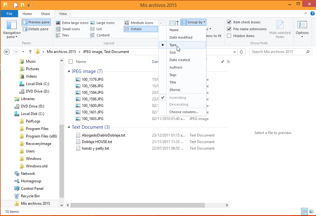 14. En la ficha View, en el grupo Current View, haga clic en Group by y clic en Type. Observe como se agrupan los archivos por su tipo de extensión. Por ejemplo, de esta manera podemos saber que tenemos 7 imágenes JPG y 3 documentos de texto.
