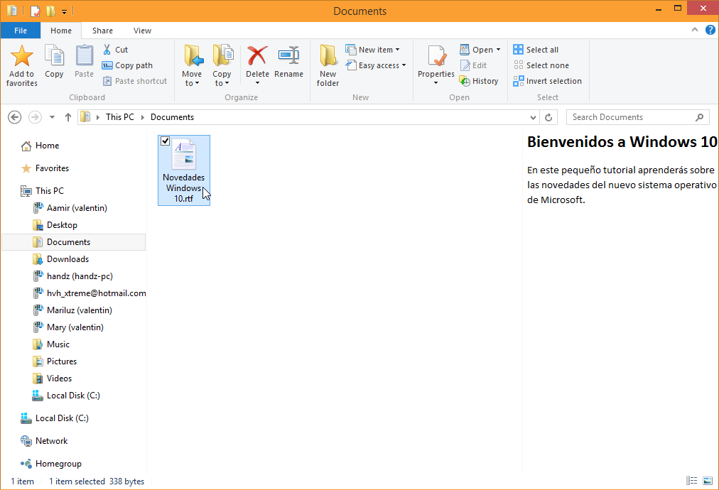 15. Cierre WordPad y vea los cambios de su archivo en el panel de vista previa de su biblioteca Documents.
