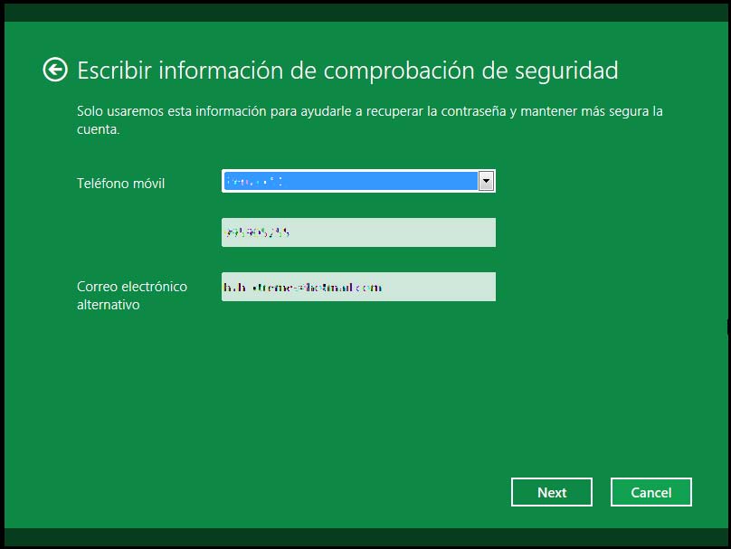 19° Ahora escriba algunos datos de confirmación, como por ejemplo su número de teléfono móvil y un correo alterativo para recuperación de contraseña en caso de pérdida. Haga clic en Next.