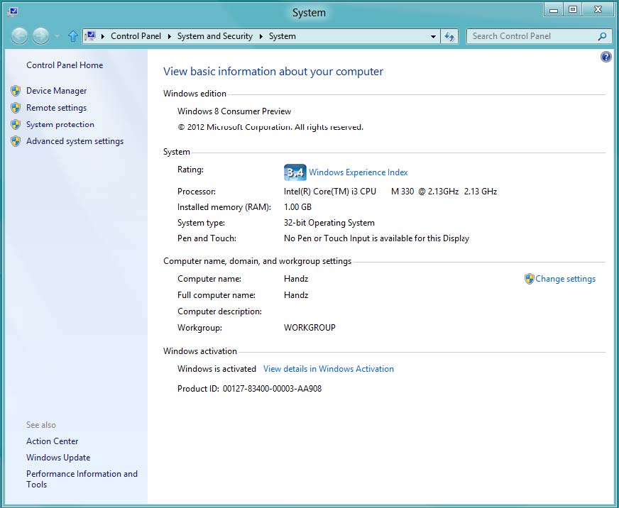 Si su copia de Windows ha sido activada, aparecerá Windows is activated (Windows está activado) en el área Windows activation en la parte inferior de la ventana. De otra manera, el tiempo restante del periodo de gracia aparece, con un enlace para completar el proceso de activación.