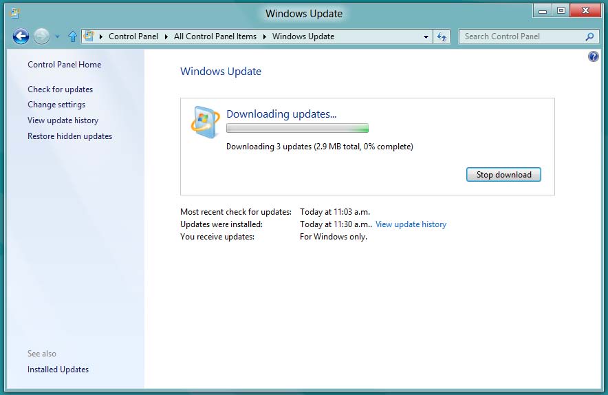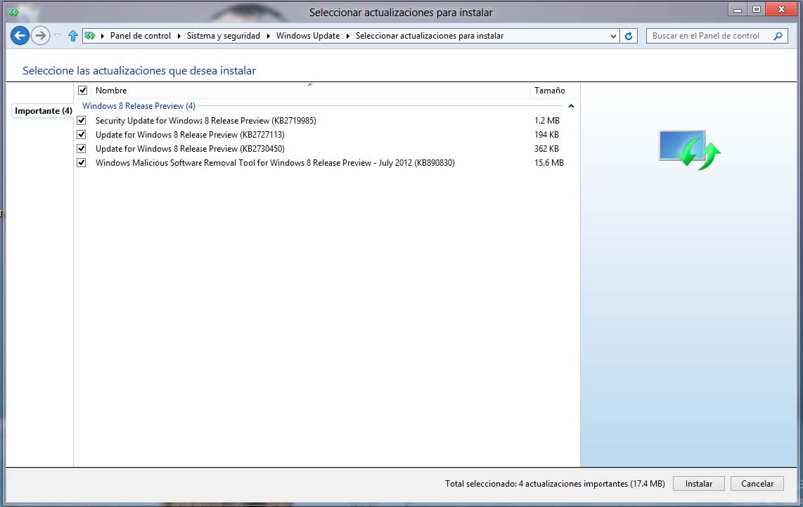 Windows Update comienza a descargar las actualizaciones seleccionadas y los instalará. Una vez terminado el proceso, tenga por seguro que Windows 8 le pedirá reiniciar.