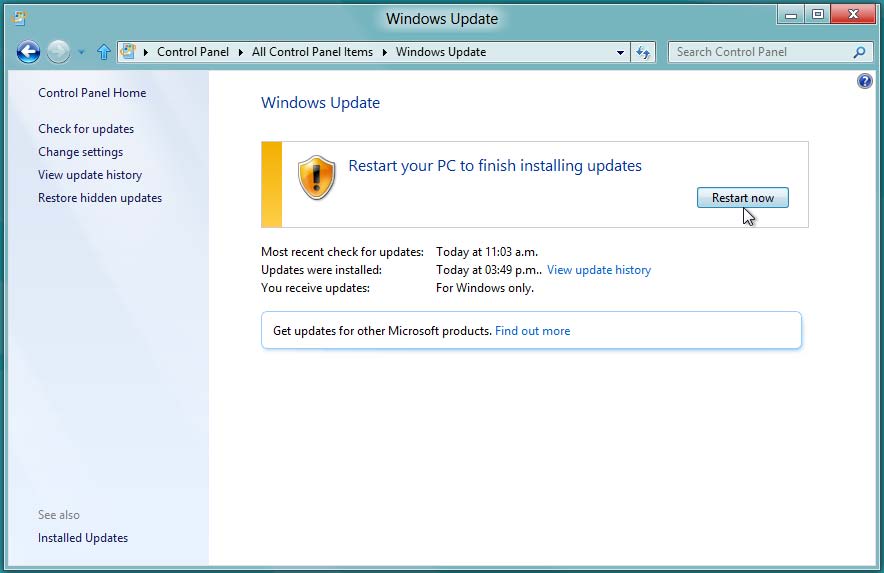 5° Haga clic en Reiniciar ahora. Windows completará la configuración de las actualizaciones instaladas. Antes y después del reinicio de su equipo. Después que su equipo se reinició, inicie sesión y a continuación repita el paso 1 y 2 para ingresar nuevamente a la ventana de Windows Update.
