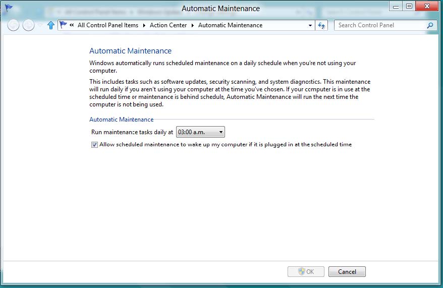 Esta ventana permite configurar la programación del mantenimiento de Windows diariamente cuando no se está usando el equipo. Estas tareas incluyen actualizaciones de software, seguridad, y diagnóstico del sistema. Si su equipo está en uso a la hora programada para el mantenimiento, este se hace detrás del escenario. Por ello siempre seleccione un horario libre, como por ejemplo después de su día laboral.